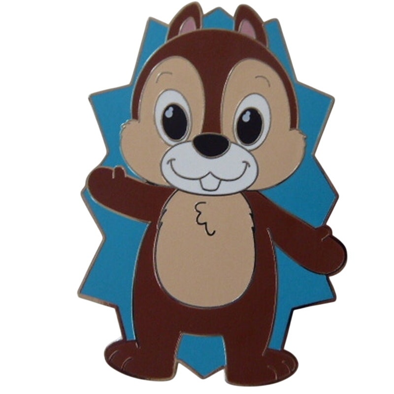 The Chip pin shows a smiling Chip standing in front of a blue starburst. Chip is posed to wear any of the magnetic outfits in the Park Pals Set.