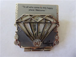 Each month a new pin with a memorable Walt Disney quote, will be released as we get closer and closer to the big 60th Anniversary Diamond Celebration! This pin is done in a silver hue and features the following Walt Disney Quote: "To all who come to this happy place: Welcome." The front of this hinged pin is a stained glass element in the shape of a diamond jewel. Pins in this series: #107707-107713. This is the last in the series.Share