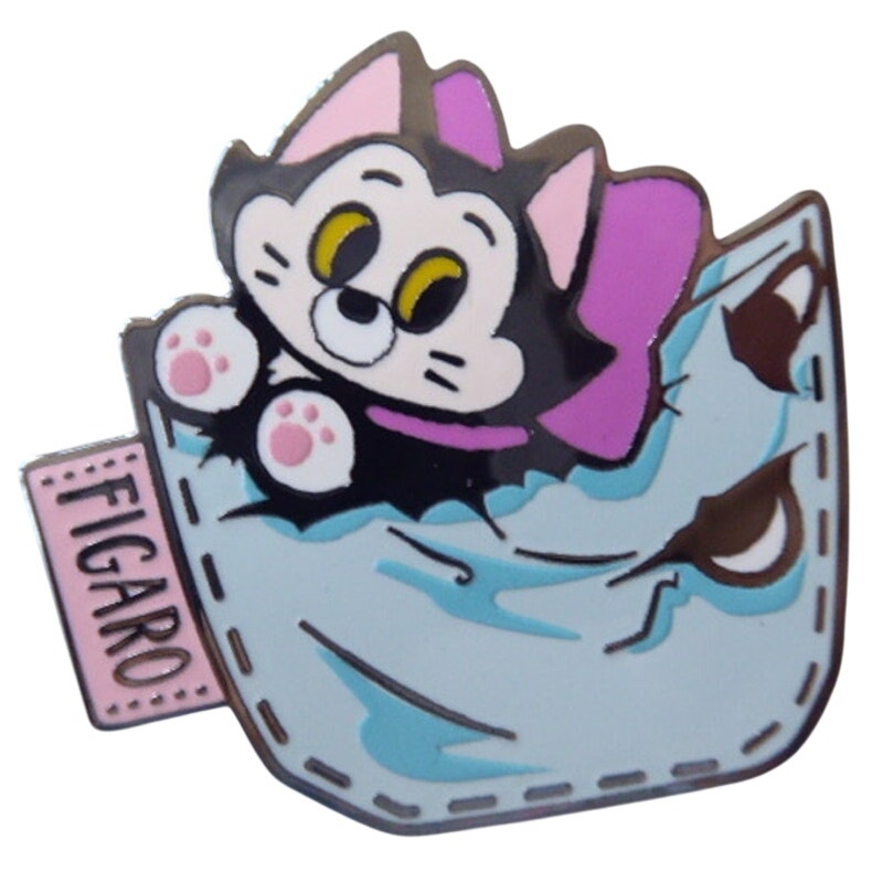 This pin is of Figaro the adorable cat from Pinocchio. He is inside of a light blue pocket. There is a light pink pocket tag that reads: FIGARO.