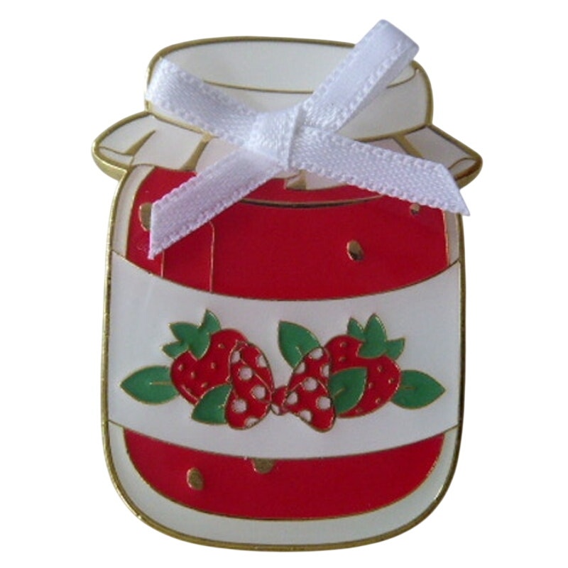 Each pin is shaped like an old-fashioned canning jar and is filled with a jam (or jelly or butter) themed after a different Disney character. Each pin is embellished with a piece of real, white, crafting ribbon tied into a bow.