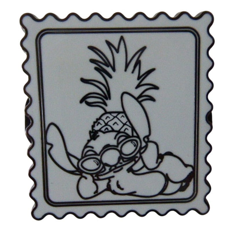 This Rare pin features STITCH wearing sunglasses and posing (in a lounging position) in front of a pineapple. The entire pin is white enamel.
