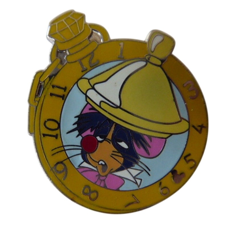 This pin features Dormouse's head with a tea pot lid on it inside of the White Rabbit's gold pocket watch. Clock numbers 1, 3, 4, 5, 6, 7, 8, 9, 10, 11 and 12 shown around the edge. A small Hidden Mickey icon is located on the bottom right of the pin.