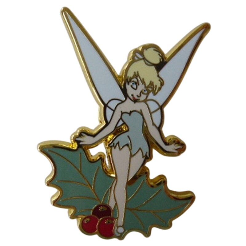 This pin features Tinker Bell, arms out, standing in front of a sprig of green holly with red berries.