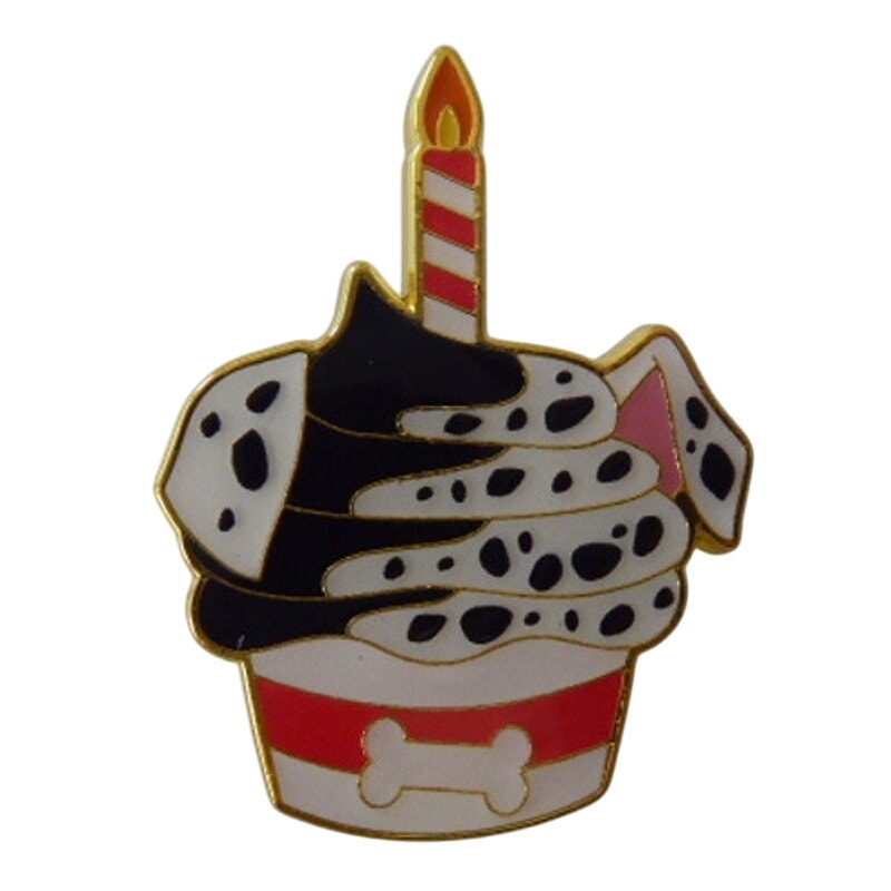 This pin is themed after one of the puppies from 101 Dalmatians. The frosting is striped in black and white, and the wrapper is white with a red collar and white dog bone on the front of it. The top is decorated with frosting to look like his ears.