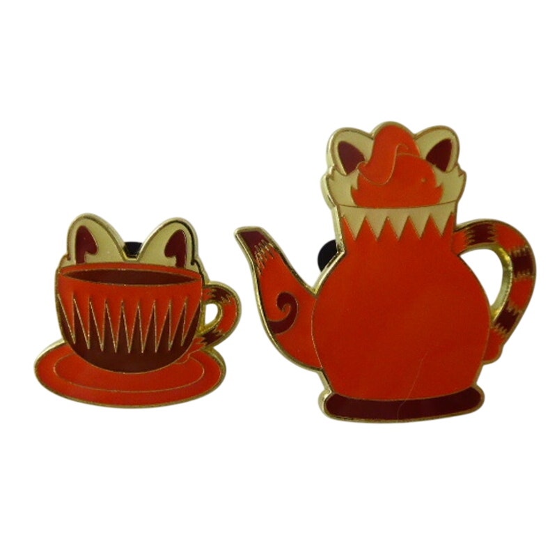 This pair, from the PIXAR movie TURNING RED, features MeiMei red panda as the teapot and Ming red panda as the cup. Each is bright red with yellow and brown ears. MeiMei has a brown and red striped tail as the handle and Ming has a smaller version of the same handle and has long brown spikes. The plate is bright red.