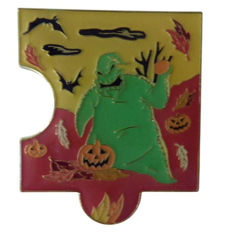It features Oogie Boogie from Tim Burton's film The Nightmare Before Christmas, standing in the middle of the pin holding an orange up in his hand on a maroon background with engraved, carved pumpkins. The sky is orange-brown. Autumn leaves swirl all around.