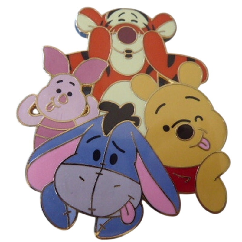 This 2.5" cutout pin shows Winnie the Pooh, Tigger, Piglet, and Eeyore acting silly to pose for a photograph.