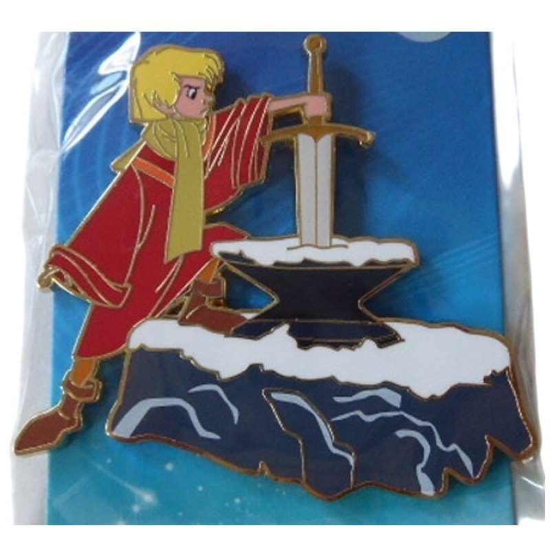 This 2.75" pin shows Arthur attempting to pull the sword from the stone. He is wearing his traditional attire from the film.