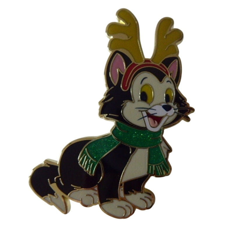 This 2.5" pin shows Figaro sitting with a smile on his face, wearing a glittery green scarf and yellow reindeer antlers.