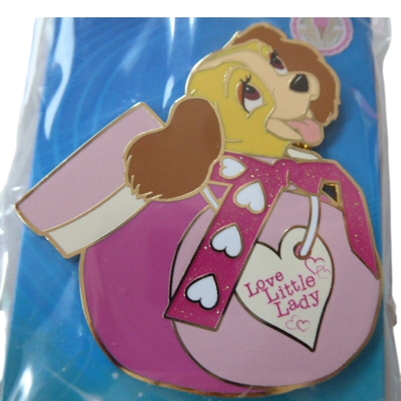 This 2.5" pin depicts Lady inside a candy jar with her head poking out. There is a glitter-filled pink ribbon with white hearts around the opening of the jar. The label reads LOVE LITTLE LADY with hearts