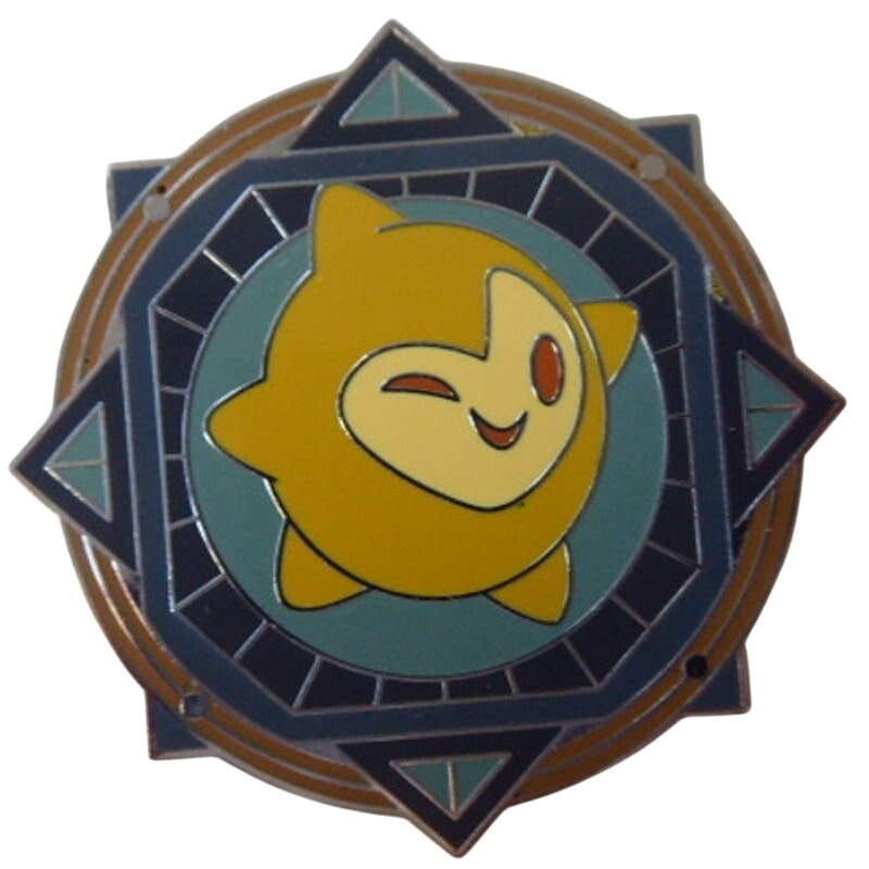 Part of an 8 pin mystery box series. Star is gold and dark yellow with dark red eyes and mouth. He has one eye shut. The background is teal, black, dark teal and brown. Star is from the movie Wish.