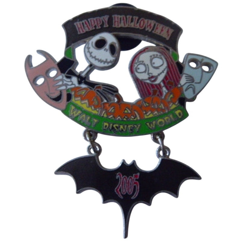 Jack Skellington and Sally from Tim Burton's Nightmare Before Christmas take off their masks of Lock and Shock to wish everyone a "Happy Halloween!" This Limited Edition pin features a dangle in the shape of a bat that is dated "2005." This pin was designed by Artist Keri Murphy from Disney Design Group