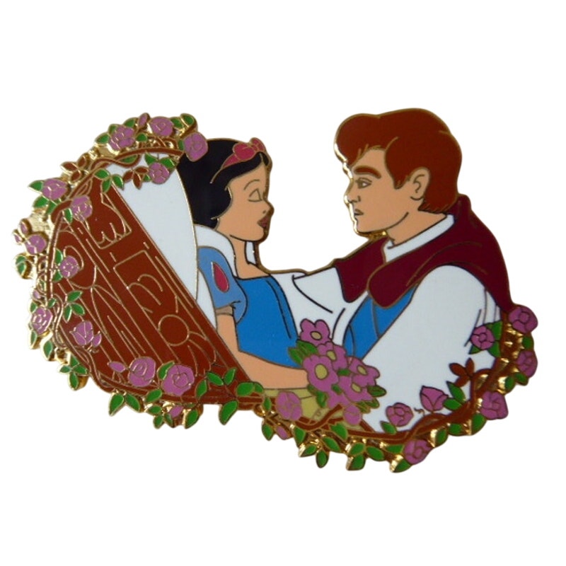 Prince Charming (top-right), leans over Snow White; he is dressed in a white shirt with blue, and maroon cape. Snow White lies in a brown dwarf bed with white pillow. She is in her blue outfit with red hairpiece. Red flowers with green leaves frame the pin on the left, right and bottom.